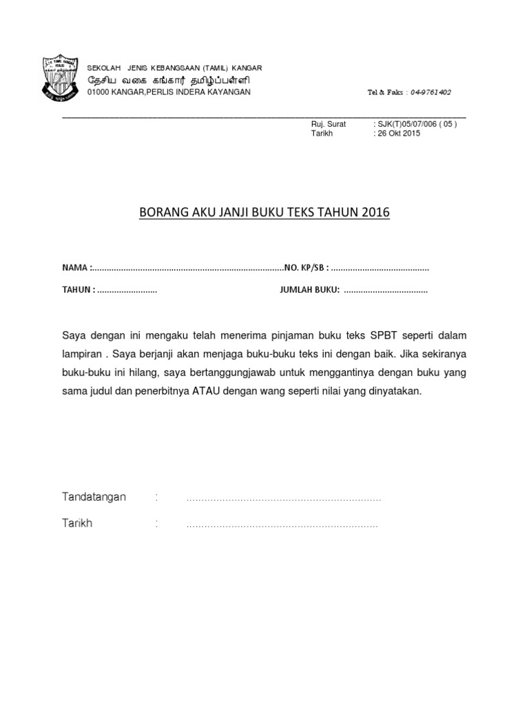 Saya yang bernama seperti di atas dengan ini mengaku bahawa saya bersetuju akan mematuhi segala peraturan sekolah. Contoh surat aku janji ibu bapa sekolah kebangsaan limau limau beluran peti surat 27 pulau jambongan 90. SURAT AKUJANJI OLEH PEMAJU 1.
